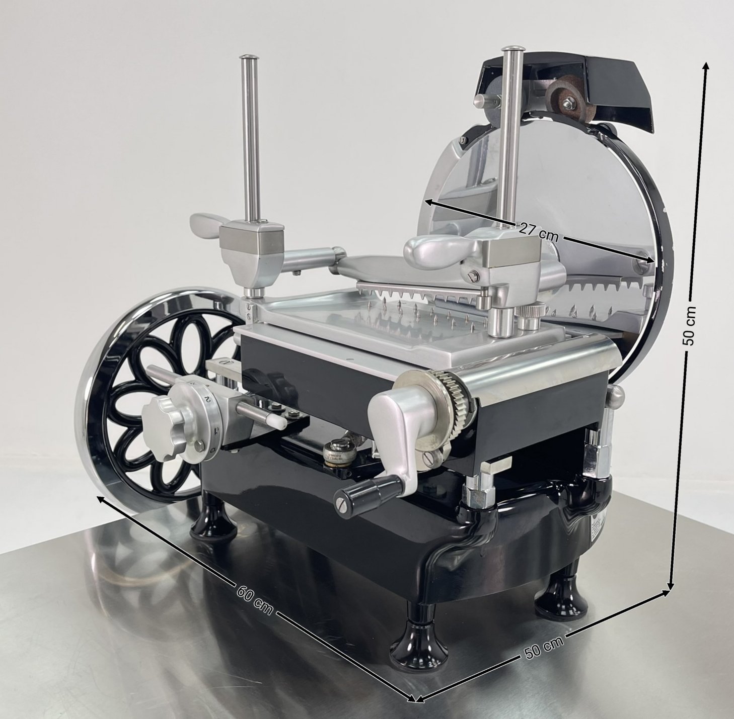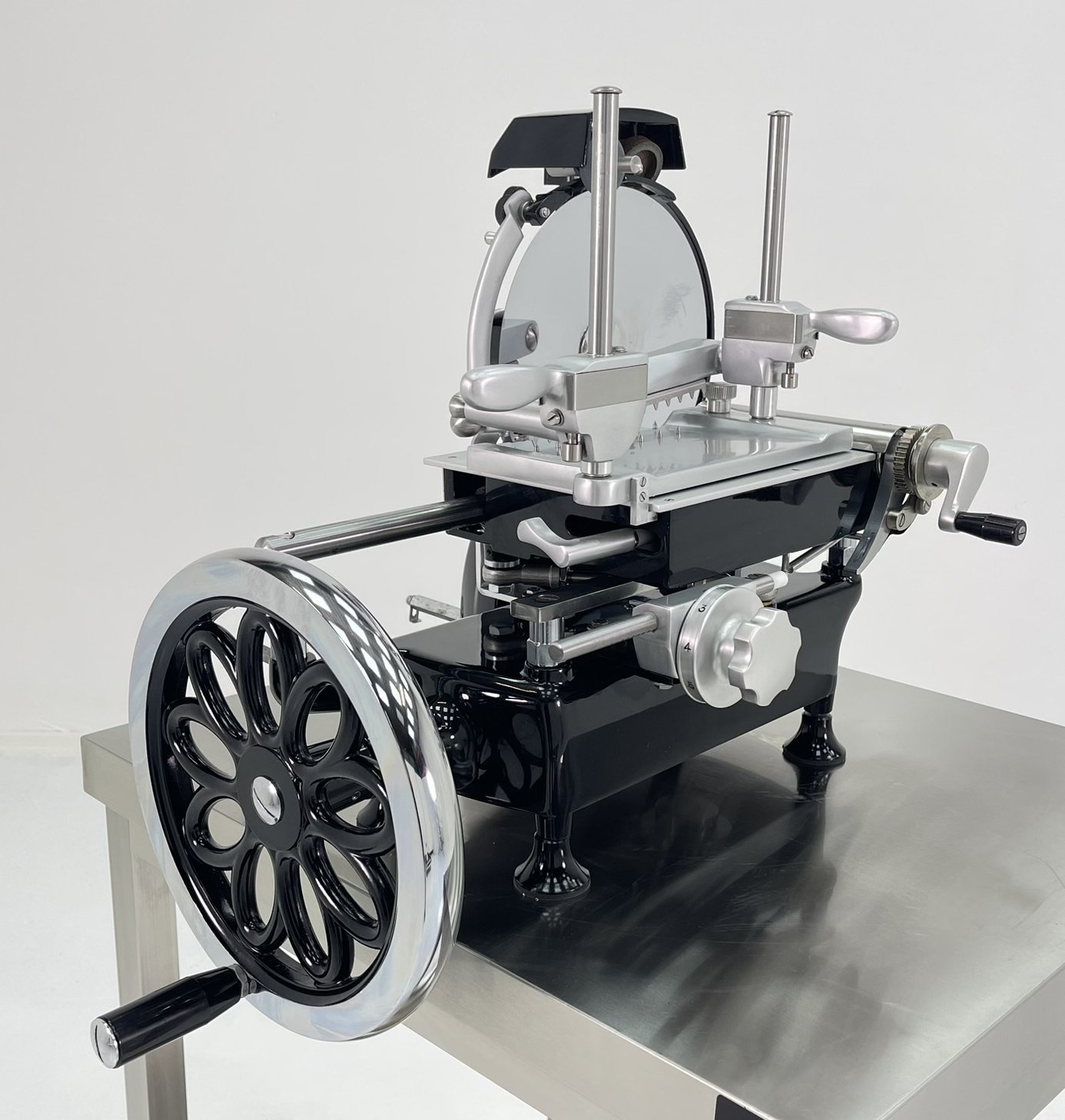 Stylový italský ruční kráječ s volantem pro precizní krájení uzenin, masa. Model